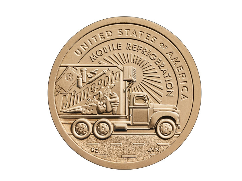 На монете Миннесоты изображён грузовик 1940-х годов, оснащённый одним из первых холодильных агрегатов с фронтальной установкой. Боковая часть грузовика украшена изображениями различных товаров, чувствительных к температуре, что символизирует расширение возможностей дистрибуции благодаря этому нововведению. Надписи на монете гласят: «СОЕДИНЁННЫЕ ШТАТЫ АМЕРИКИ», «МИННЕСОТА» и «МОБИЛЬНЫЙ ХОЛОДИЛЬНИК».